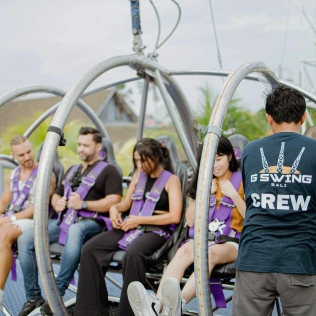 G-Swing tidak hanya menawarkan pengalaman yang menggembirakan dan tak terlupakan, tetapi dengan mengetahui bahwa G-Swing didukung oleh standar keselamatan tertinggi, Anda dapat berayun dengan tenang. Sensasi melayang di udara dengan kecepatan tinggi dilengkapi dengan kepastian bahwa setiap langkah keamanan telah dilakukan, sehingga Anda dapat menikmati perjalanan dengan percaya diri. Baik Anda mencari petualangan yang memacu adrenalin atau cara unik untuk menikmati pemandangan Bali yang menakjubkan, G-Swing memberikan perpaduan sempurna antara keamanan dan kegembiraan. Bersiaplah untuk memacu adrenalin yang akan meninggalkan kenangan yang tak terlupakan seumur hidup-semua dengan tetap mengutamakan keselamatan.